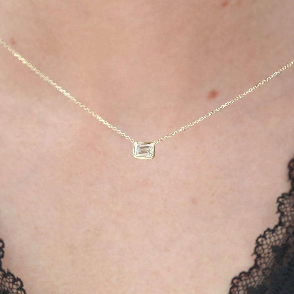Elevate your everyday style with this 1 carat emerald-cut diamond bezel pendant. The clean lines, mirror-like facets and sleek bezel frame create a refined, modern look that sits beautifully on the necklineโperfect for daily wear or elegant evenings.